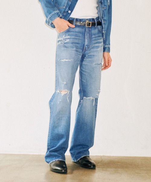 人気スタイリストの野口強とコラボした、ブーツカットタイプのダメージデニムです。生地には70年代から80年代のヴィンテージ感を再現した、12.5オンスのオールドブルーデニムを採用。色落ちやクラッシュ、リペアなど高度なエイジング加工を駆使し、長年穿き込んだようなリアリティあふれる風合いを再現しています。