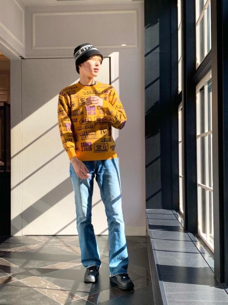 ブーツカットデニムの反対色である、マスタードイエローのプルオーバーを合わせはっきりとしたコントラストを作ることでインパクトのある着こなしに。バケットハットとスニーカーは引き締め効果のある黒を選び、配色が派手にならないようバランスを取っています。