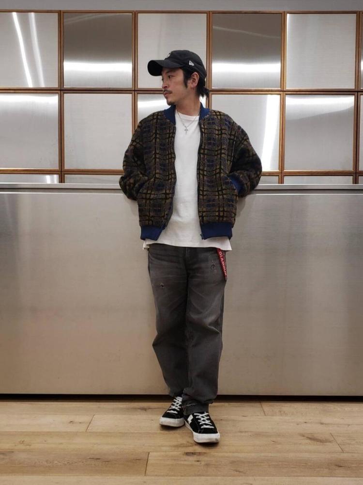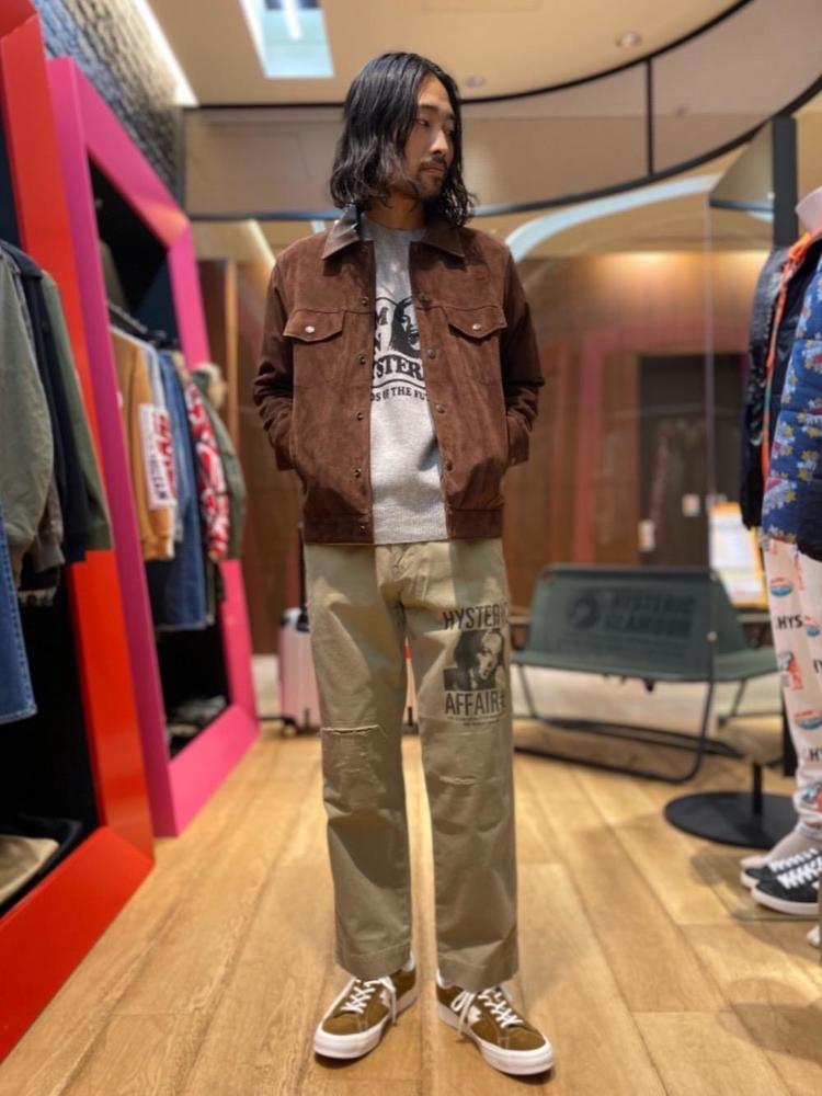 全身をブラウン系ワントーンでまとめれば、大人なアメカジコーデに仕上がります。スウェード生地のジャケットが季節感のある温かみを演出。トップスとボトムスに入った黒のグラフィックデザインが、柔らかなブラウンを引き締めています。
