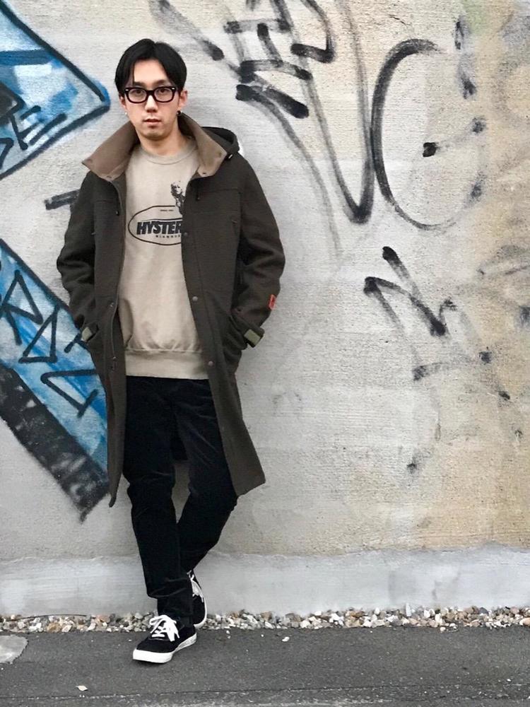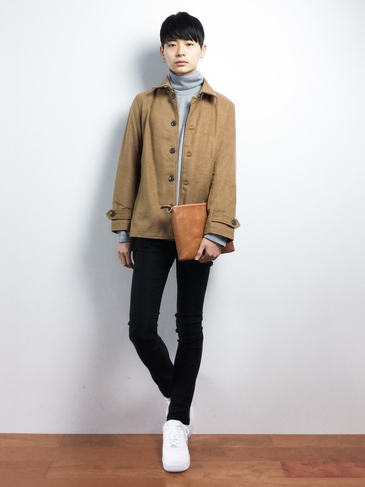 ヒステリックグラマーのシンプルなタートルネックを使った、トラッドなメンズコーデです。トップスやボトムスはモノトーンでまとめつつ、アウターに柔らかな印象のベージュを選ぶときれいめな着こなしに。