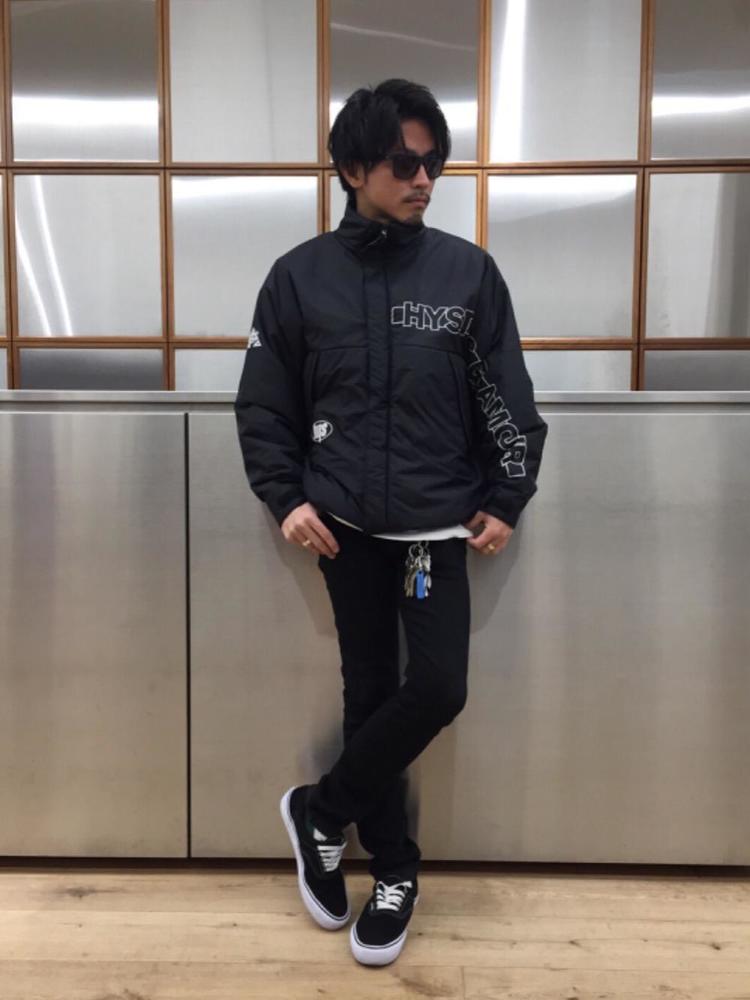 タフな雰囲気がかっこいいブラックコーデです。オーバーサイズTシャツはレイヤードさせるように、裾を少し出し白を取り入れることがぬけ感を作るポイント。ナイロンジャケットの軽い光沢感が、ブラックコーデにありがちな重たさを緩和させてくれています。