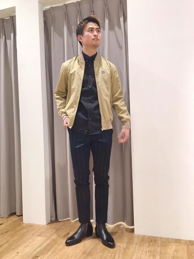 黒シャツやブーツを組み合わせ、きれいめカジュアルを作ったメンズコーデです。ジャケットではなくブルゾンを合わせ、かっちりとした着こなしにならないよう仕上げています。ストライプ柄のスラックスは脚長効果も。アウター以外はダークトーンで統一しシャープな印象にまとめることが、全身をスッキリと細身に見せるコツです。