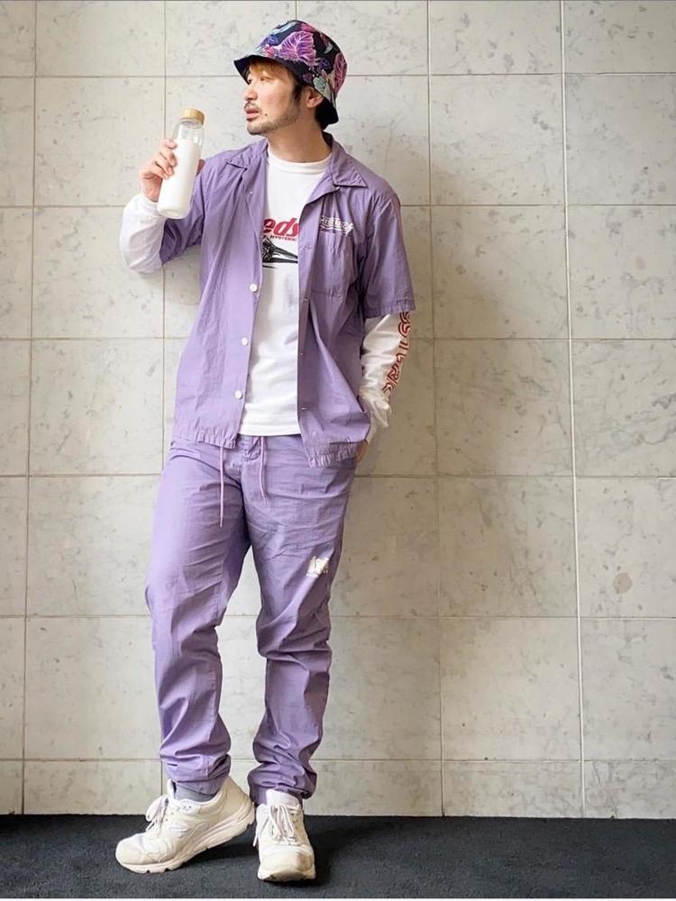 パープルのセットアップを着こなした、ワンランク上のアメカジコーデです。インナーとスニーカーは白を合わせ、パープルとのコントラストを和らげることでキツイ印象にならず、こなれた着こなしに。黒のバケットハットで軽く引き締めています。