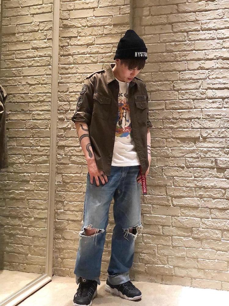 ヒステリックグラマーのアイテムを使った、おしゃれなメンズコーデを紹介します。デザイン性の高いアイテムの着こなし方を参考にしてみましょう。