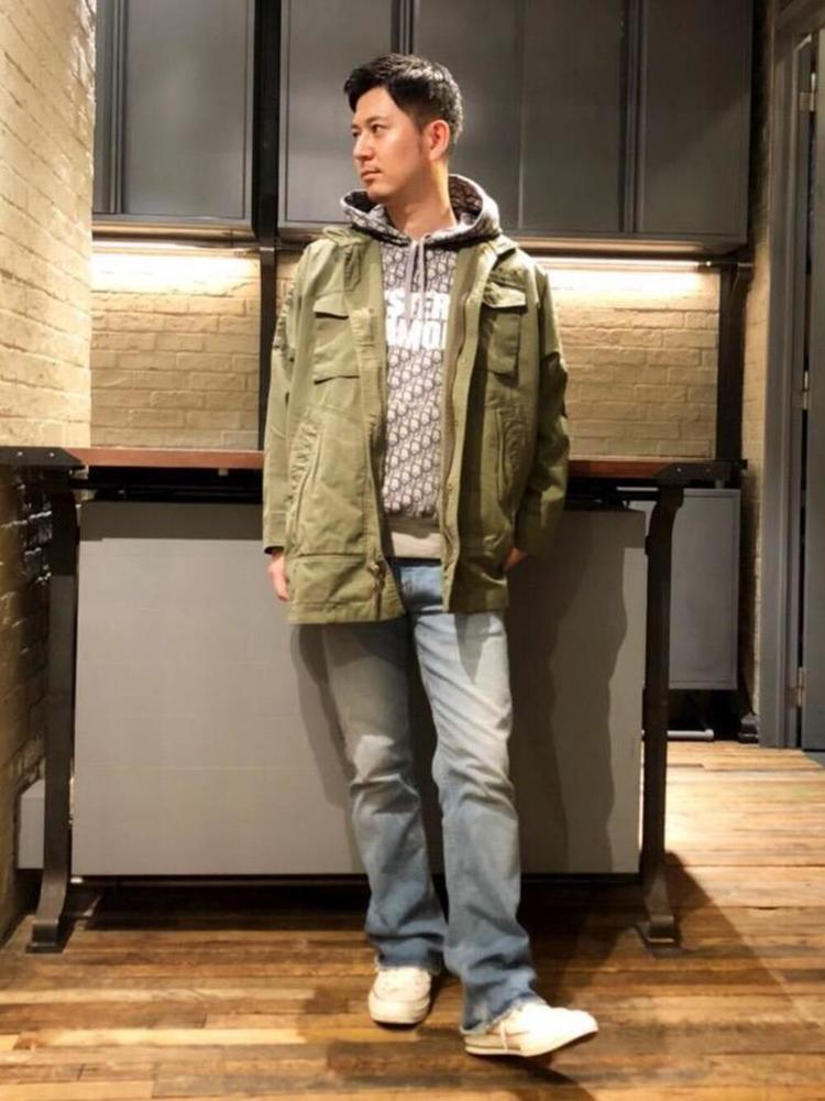 パーカーとミリタリージャケットで、カジュアルにまとめたメンズコーデです。カーキ、グレー、ライトブルーと全体的に淡いトーンでまとめれば、ラフな着こなしも柔らかな雰囲気に。パーカーに柄が入っているので、その他のアイテムは無地で統一しバランスを取っています。
