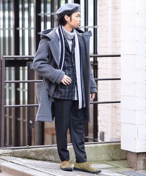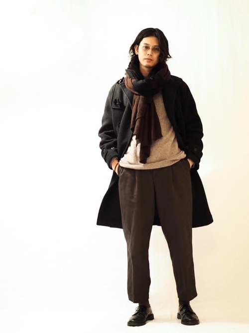 全体的に暖色系な配色で落ち着いた着こなしの彼。ストールのボリューム感がアウターのマーティンスリムロングダッフルコートと上手くマッチしていて、大人の上品さをかもしだしているのが見て取れます。ボトムスにはプチプラブランドで知られるユニクロのパンツを上手く取り入れ、安っぽさを感じさせない着こなし方だと言えましょう。