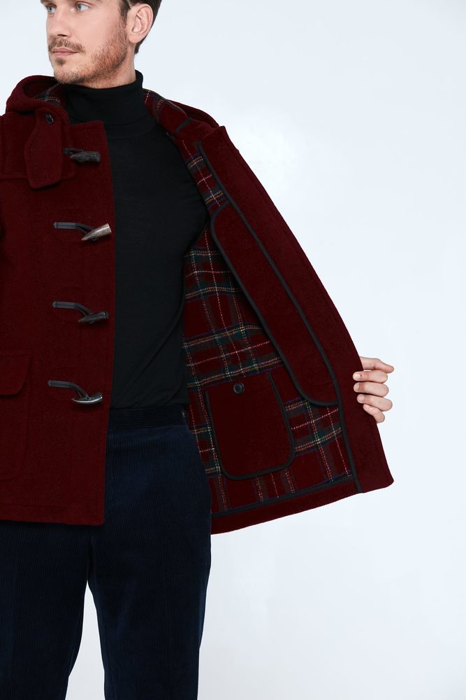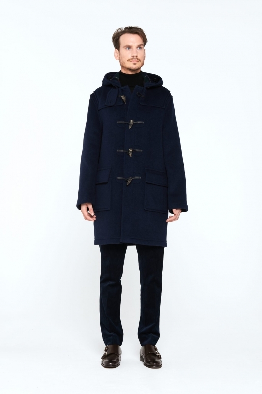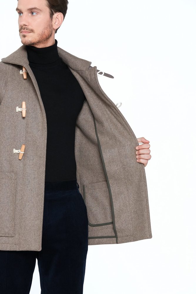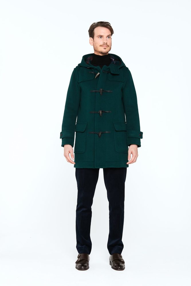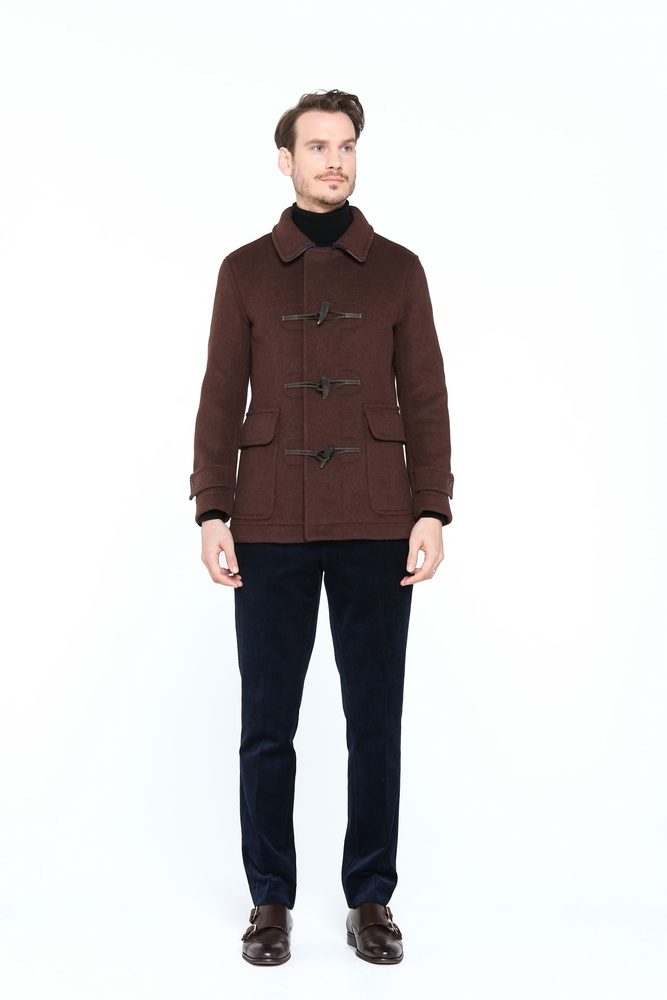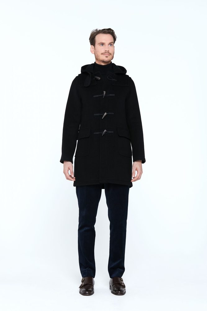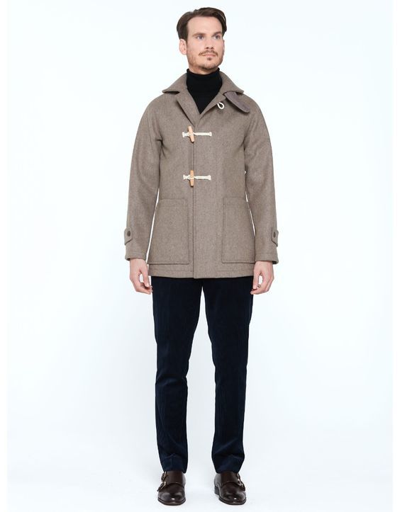 水牛の角で作られたトグルボタンが見た目に高級感のある、ショート丈のメンズダッフルコートになります。生地はロンドントラディションらしいダブルフェイス仕様になっており、スリムなシルエットがとても魅力的です。フードが付いてないので、インナーにパーカーを合わせるとおしゃれな着こなしに仕上がりますよ。