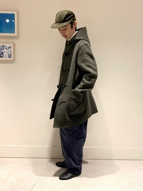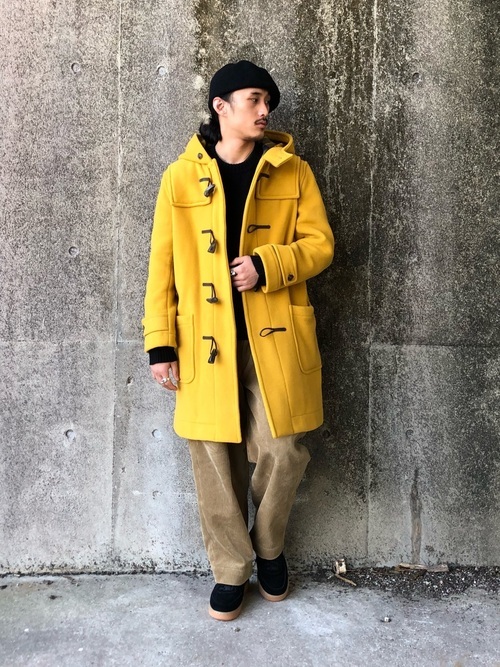 ハンチング・ニット・靴を落ち着いた配色にすることで、アウターのダッフルコートの黄色が引き立って見えます。ボトムスのコーデュロイ素材のワイドパンツが、柔らやか雰囲気を演出していていいですね。