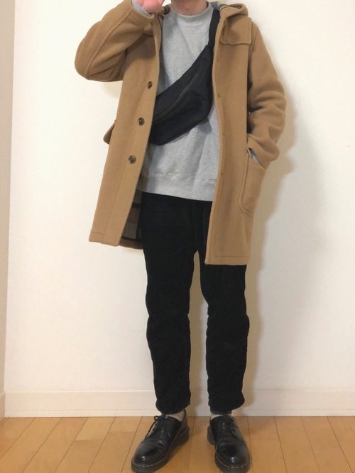 ダッフルコート×スウェット×パンツ×革靴×ボディバッグ