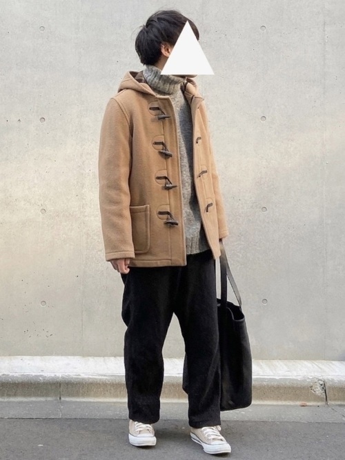 人気のマーティンスリムダッフルコートにルーズシルエットのパンツを合わせて、カジュアル感を演出した着こなしに仕上がってます。アウターやインナーだけじゃなく、足元のスニーカーも暖色系の色合いにしている点がコーデのポイントですね。