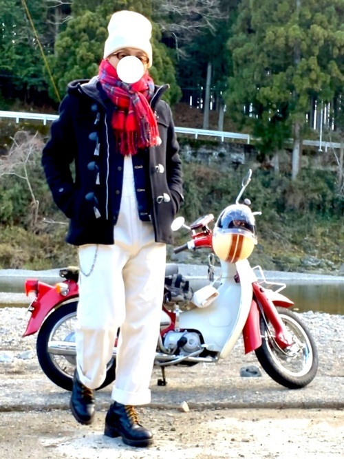 ニットキャップ×ダッフルコート×ジージャン×オーバーオール×ブーツ×マフラー