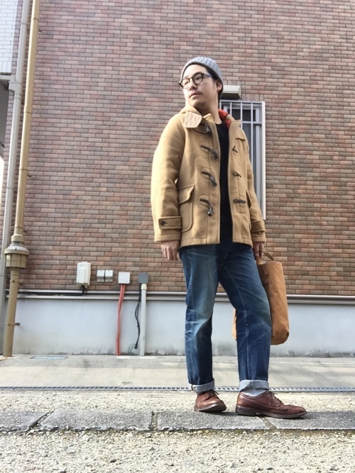 キャメルカラーのマーティンスリムダッフルコートにロールアップしたジーンズを合わせ、更にインナーに着ているスウェットがカジュアル感を演出。足元に見えるオールデンの靴が、ダッフルコートとマッチして上品さを引き立てているのが見て取れます。