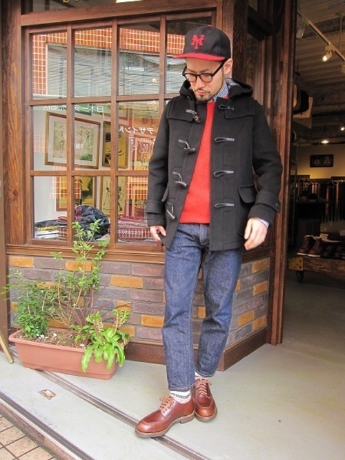 ダッフルコート×ジャケット×シャツ×ジーンズ×ブーツ