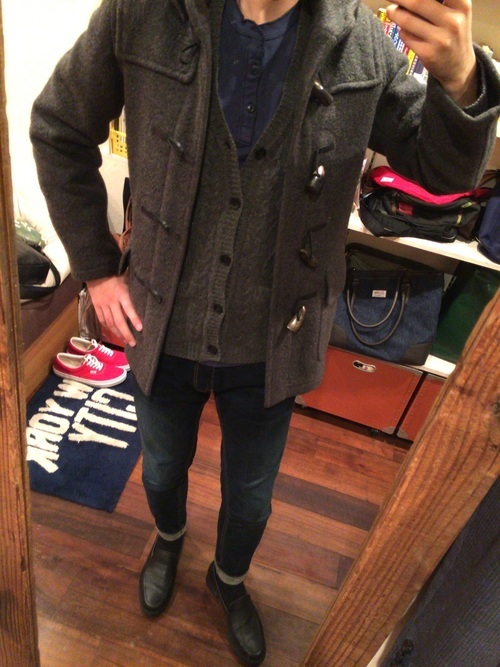 ダッフルコート×カーディガン×シャツ×ジーンズ×革靴