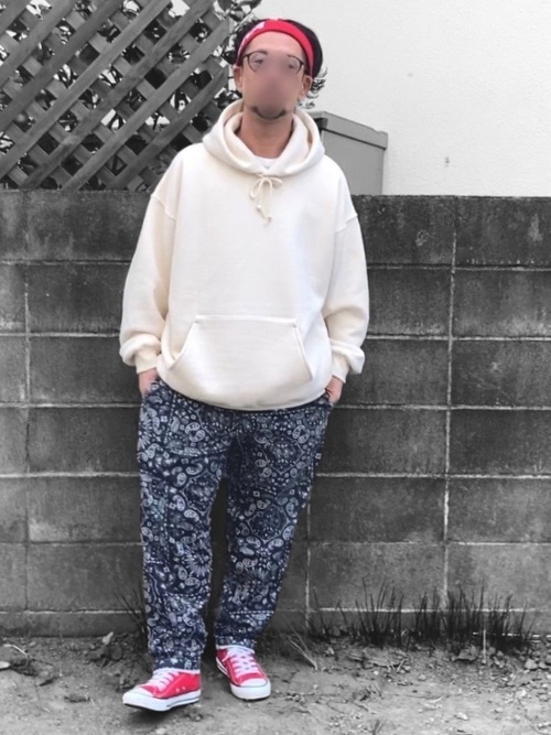 レッド系のヘアバンドに白色パーカーを合わせたおしゃれなメンズコーデです。街中でも全く違和感を感じないようなコーデになっています。また、使用しているヘアバンドはNEWERAのヘアバンド。スポーツでも良く使用されているタイプなので、運動の際にも使用できそうです。