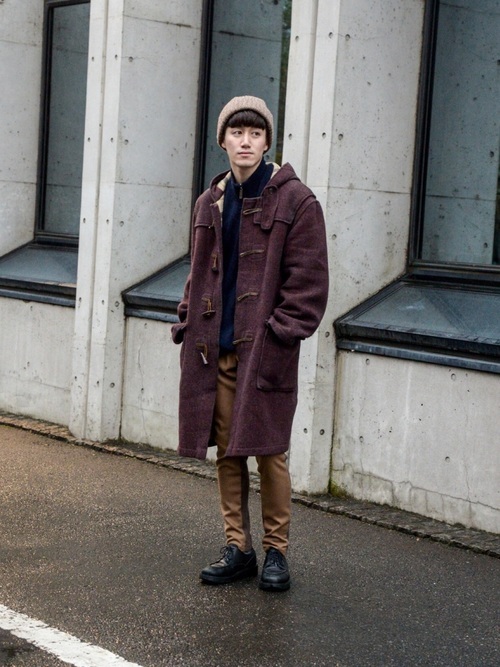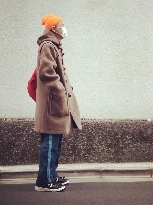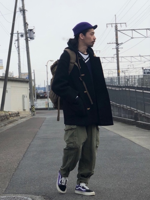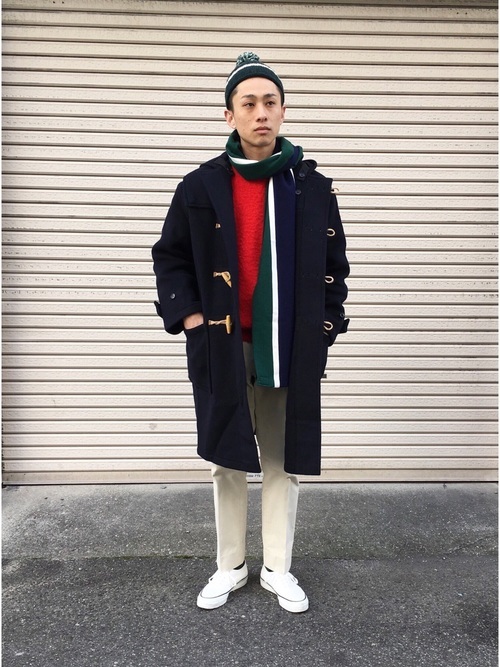 グローバーオールのダッフルコートにPOLO RALPH LAURENのアノラックジャケットをレイヤードしたストリートスタイルです。ブルーと赤を効果的に配置したスポーツMIXスタイルにオーセンティックなダッフルコートが絶妙にマッチしています。