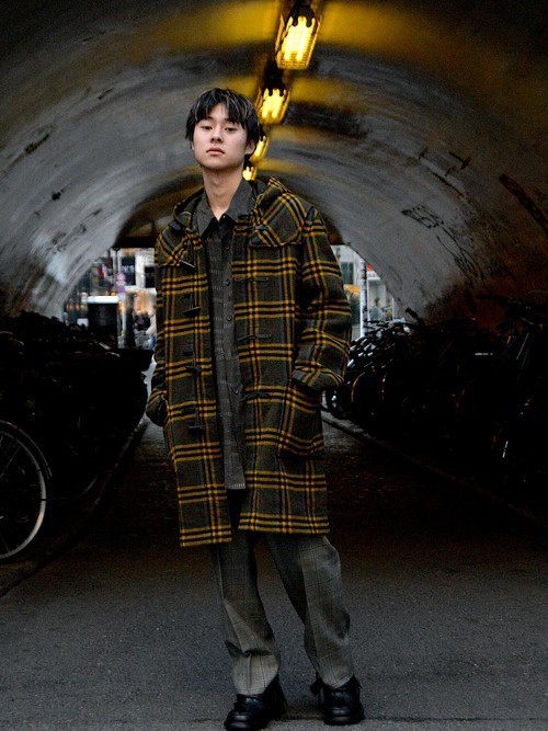 チェックダッフルコート×カーキシャツ×グレースラックス