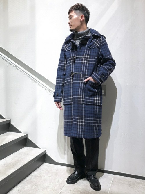 グレイッシュなブルーのチェックのダッフルコートを使用したメンズコーデです。細身のクラシカルなコートを黒とグレーでシックにまとめ、モダンな着こなしに仕上がっています。