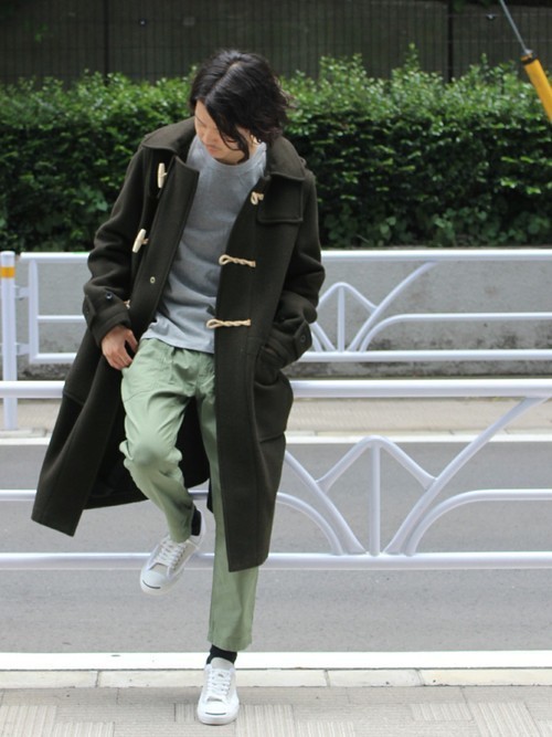 シンプルで抑えたカラーのインナーとパンツがモスグリーンのダッフルコートを引き立てているメンズコーデになります。インナーのカジュアル感と細身のコートのきれいめ感のバランスがよい着こなしです。