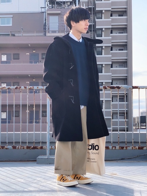 定番の黒のダッフルコートは、どんなカラーとも相性がよく、大人らしいスマートな着こなしが可能です。きれいなブルーのニットとイエローのスニーカーも引き立っていますね。シャツときれいめのベージュのパンツを合わせて、品のあるカジュアルスタイルに仕上がっています。