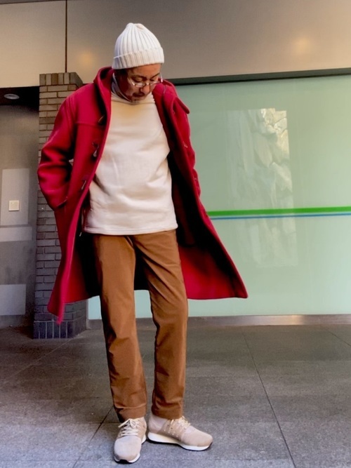 赤ダッフルコート×ベージュスウェット×ブラウンパンツ