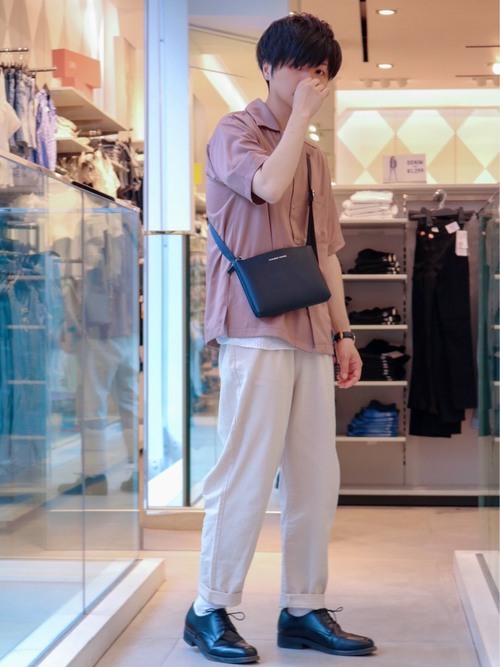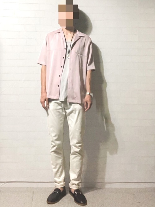 春夏らしいピンクカラーシャツと履き心地が軽くおしゃれなスリッポンコーデ。白パンツに足元はブラックスリッポンを履くことでシャープさと柔らかさがうまく融合されています。こちらも非常に春夏らしい着こなしです。