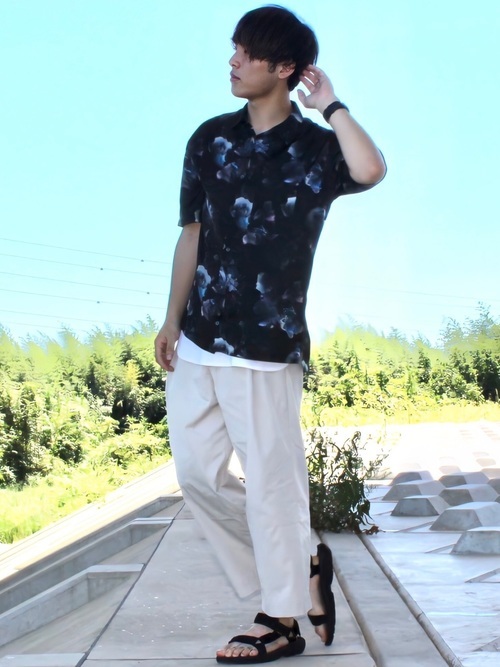 NEWダークフラワービッグシルエットアロハシャツ×白パンツコーデ