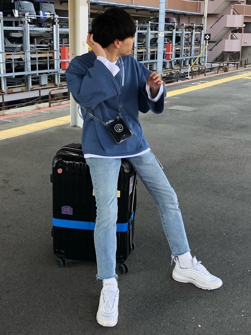 ボリューミーなスリーブロンTシャツと細身のデニムパンツコーデになります。トップスのラフさとパンツのタイトシルエットが絶妙なバランスで融合されています。春らしい淡い組み合わせの着こなしになっていますね。