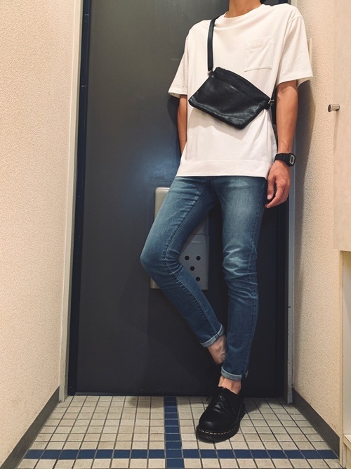 ポケット付き白Tシャツにスタイリッシュなスキニーデニムのコーデ。オーバーサイズのTシャツとピタっとした着心地のスキニーは相性抜群。シンプルな組み合わせながら、おしゃれで清潔感のある着こなしです。