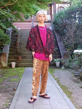 フィブリルサテンオープンカラーシャツとリネンコットンパンツの組み合わせのコーデです。全体的にゆるっとした印象の仕上がりです。淡いピンクシャツにベージュパンツのカラーコーデが春を思わせます。