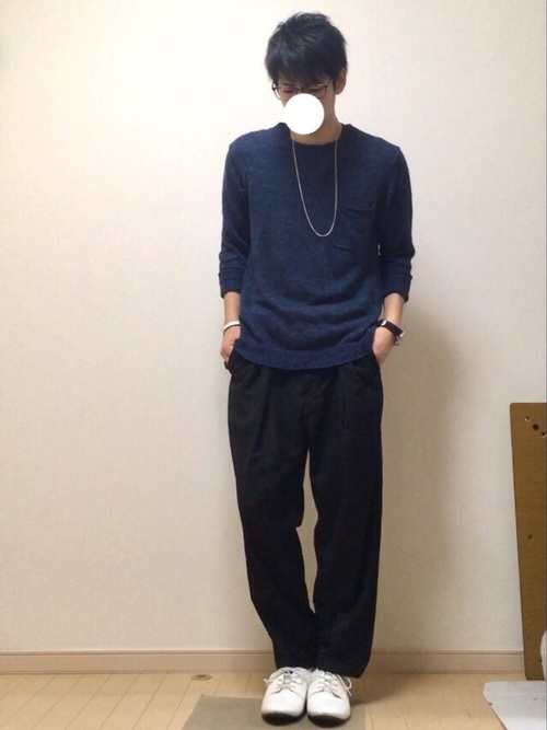 ネイビーカラーのサマーニットとステュディオスのネックレスコーデ。トップからボトムスはシンプルなデザインのサマーニットとワイドパンツ。そこにネックレスを加えることでおしゃれ感も上がり、コーデのアクセントになっています。