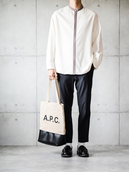 シックな雰囲気のバンドカラーシャツとスラックスパンツコーデ。衿と前立てが色味の変化があり、ややワイドなスラックスを組み合わせることで、おしゃれ感がアップしています。