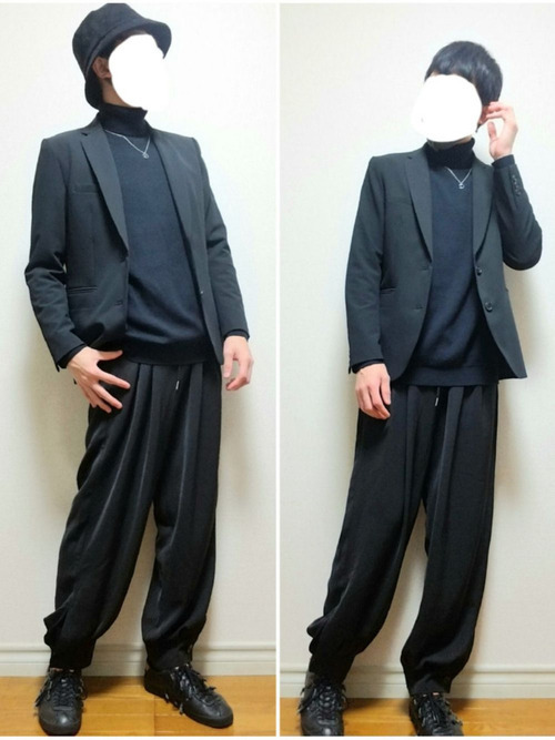 ステュディオスのリブタートルネックとバケットハットのコーデになります。全体的にブラックカラーに統一されたシックな装いになっています。スタイリッシュできれいめコーデが好きなメンズにおすすめです。
