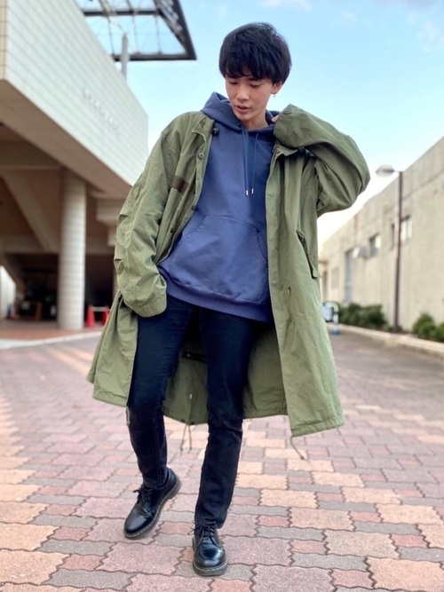 ブルーカラーのパーカーとモッズコートコーデになります。シンプルなパーカーに見えますが、作りが非常に感情なステュディオスのパーカー。アウターとして一枚着るだけでもかっこいいですし、写真のようにモッズコートと合わせればよりカジュアル感がプラスされます。