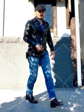 上質な革を使用したソフトラムライダースとデニムパンツのコーデ。武骨な男らしい着こなしになっていますが、ラムライダースの洗練されたデザインが清潔感を感じさせます。