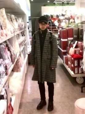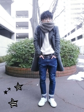 ステュディオスのスヌードとチェスターコートが冬らしいメンズコーデ。ファッション性、機能性に優れたスヌードとチェスターコートが非常にマッチしています。全体的なシルエットもスタイリッシュでかっこいい着こなしになっています。