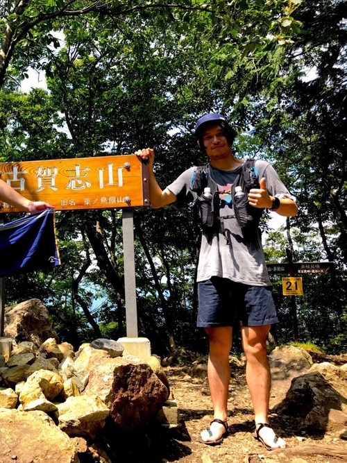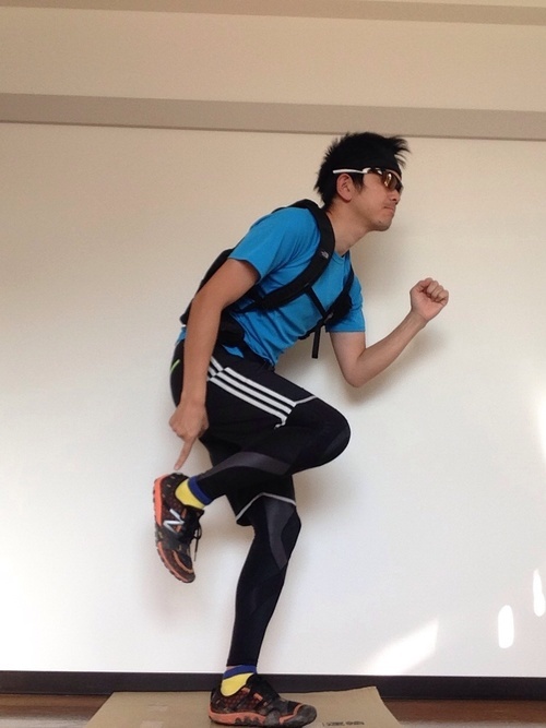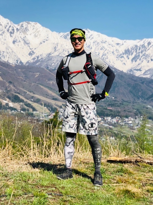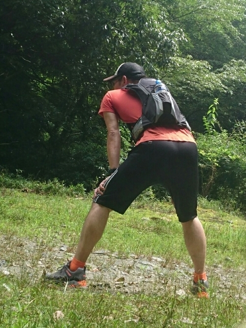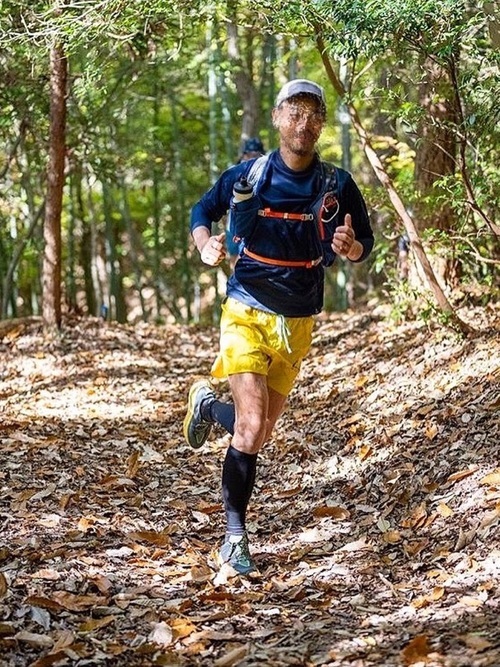 トレイルランをしている方のコーデです。山の中でも目立つカラーを着用してアクティブでおしゃれな印象に仕上げたメンズコーデです。マラソンや街中ランにもおすすめの着こなしです。
