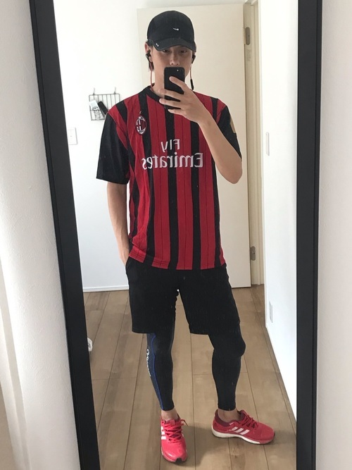 赤と黒で揃えた印象的なカラーコーデです。スポーツユニフォームのトップスを使用しているのでそのままタウンユースも可能。スポーツ観戦にもぴったりのおしゃれな着こなしでです。