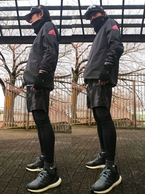 秋のランニングウェア着用のメンズコーデは落ち着いた色使いのものが多くあります。黒やグレーを基調にするとシックで都会的にキマるのでかっこいいです。
