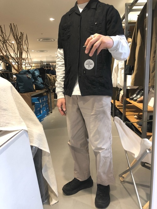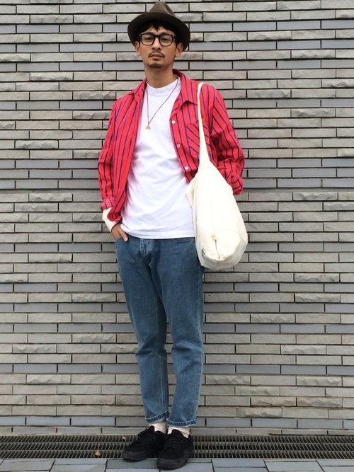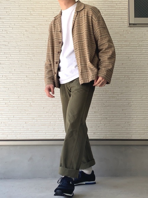 ゆったりとした長袖シャツにキャンバーのビッグシルエット半袖Tシャツを合わせたカジュアルなコーデ。ゆったりとしたシルエットのパンツを合わせていますが、ラフすぎない印象でまとまっています。