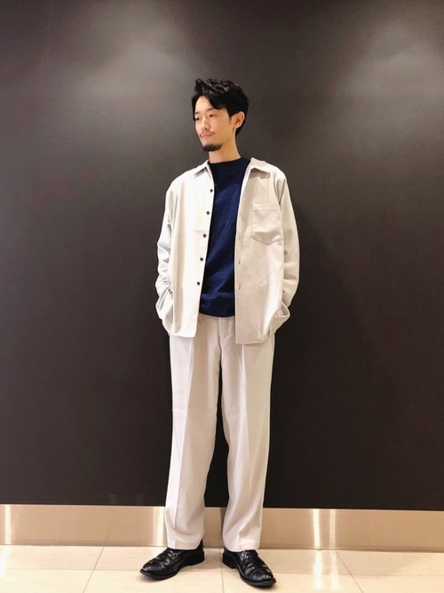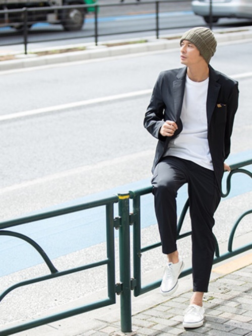 ビッグシルエットでラフ感の強いキャンバーのロンTをスタイリッシュに着こなしたコーデ。ベージュのテーラードジャケットとブラウンのドレスシューズを合わせることで、清潔感のある着こなしになっています。