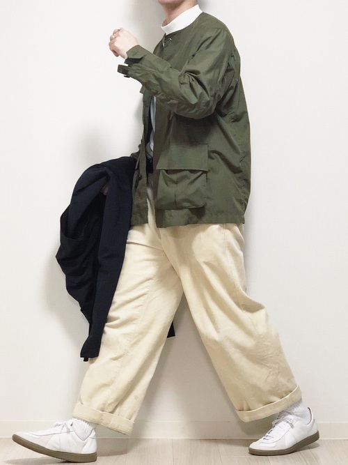 キャンバーのモックネック長袖Tシャツにミリタリー系のブルゾンを合わせた上級コーデ。太めの白いパンツがミリタリー系のブルゾンにマッチしていて程よい主張のあるカジュアルコーデになっています。