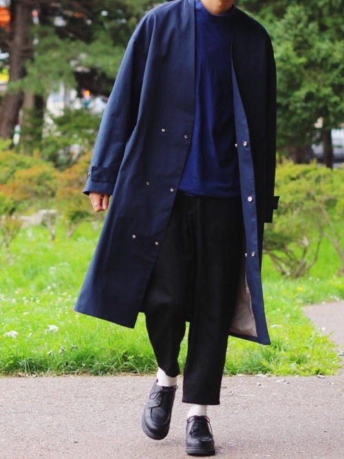 ネイビーのロンTにコートと上が重ためのカラーでも、パンツを短めにして靴下を見せることですっきりとした印象で着こなすことが可能。丈が長いパンツを穿くときは、Tシャツを白にすることで重く見えません。