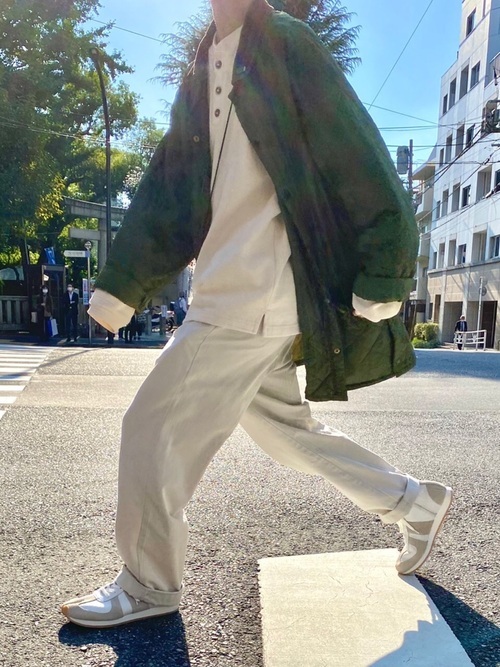 キャンバーのモックネックがブルゾンから覗くのがポイント。ホワイト系のスニーカーと合わせることで全体的な統一感を出しています。