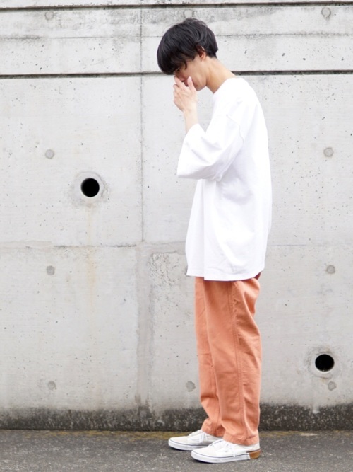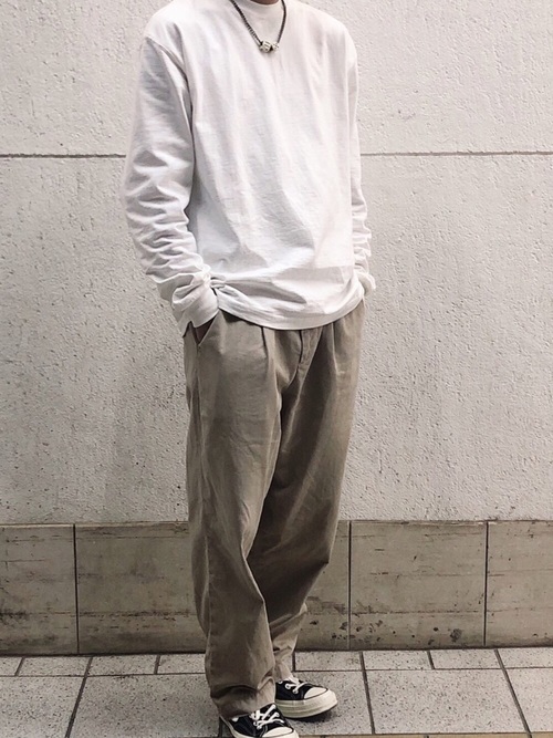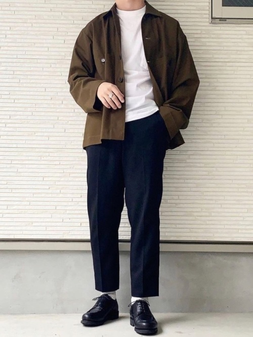 ビッグシルエットのTシャツが多いキャンバーの半袖Tシャツならではの着こなしはシンプルでも非常におしゃれ。半袖Tシャツを秋冬のコーデに取り入れる際におすすめのコーデです。