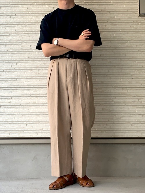 スラックスを合わせているのもポイント。キャンバーのTシャツを着用したコーデに幅を持たせたい人におすすめのきれいめなスタイルです。