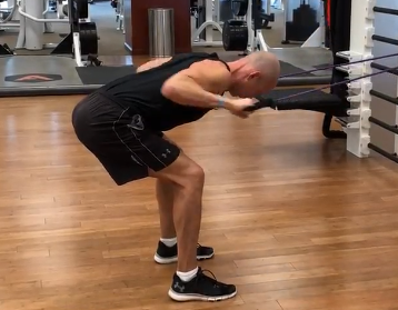 フォームを作るときには膝を軽く曲げ、背筋をしっかりと伸し、胸を張ります。トレーニングチューブを引くときには肘で引くイメージでトレーニングチューブを引いてください。