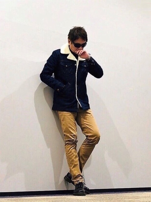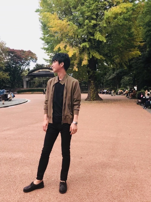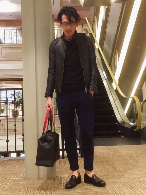 チルコロ1901のモックネックTシャツにブルゾンを組み合わせたコーデです。モックネックTシャツは黒のカラーをチョイスすることで、アウターのブルゾンのインパクトが大きくなります。タイトなサイズで整えることで、ワイルドな着こなしにも見えます。