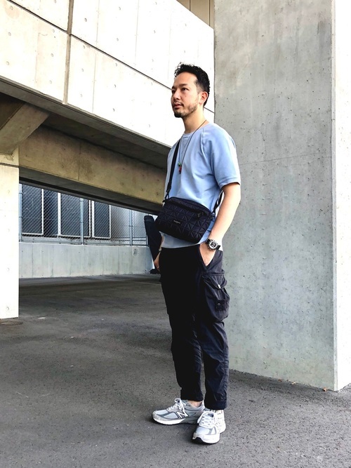 ストレッチコットン タートルネック Tシャツと明るい白のパンツとを組み合わせています。ワイド系のパンツでも、タイトなTシャツと組み合わせることで、違和感のないシルエットです。一見着こなしが難しいメンズコーデですが、サイズ感を意識することで綺麗に見えます。