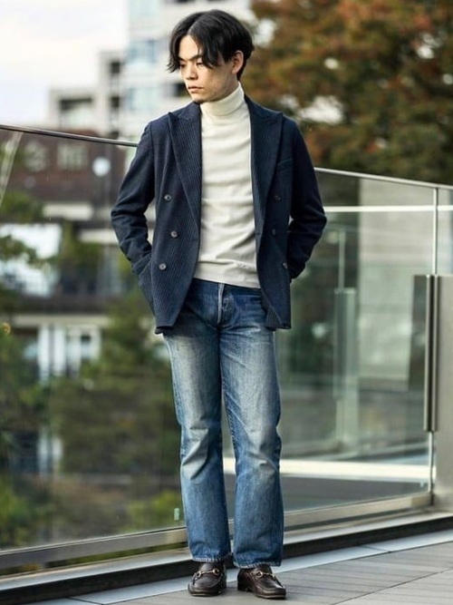 グレンチェックダブルブレストジャケットとデニムパンツを組み合わせたコーデです。堅苦しく見えがちな組み合わせですが、スウェット系生地によりカジュアルかつラフに着こなすことができます。インナーはタートルネックを使っていますが、カットソーでも綺麗なシルエットになります。